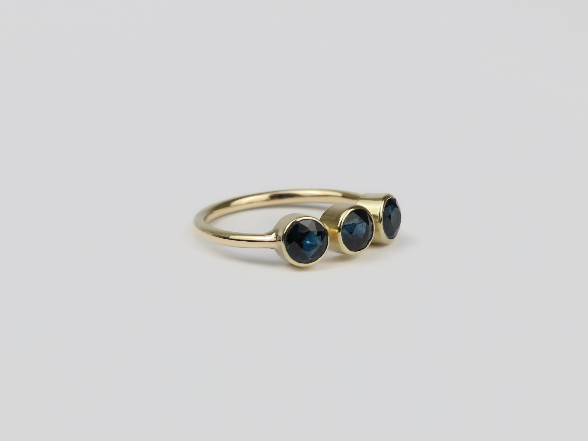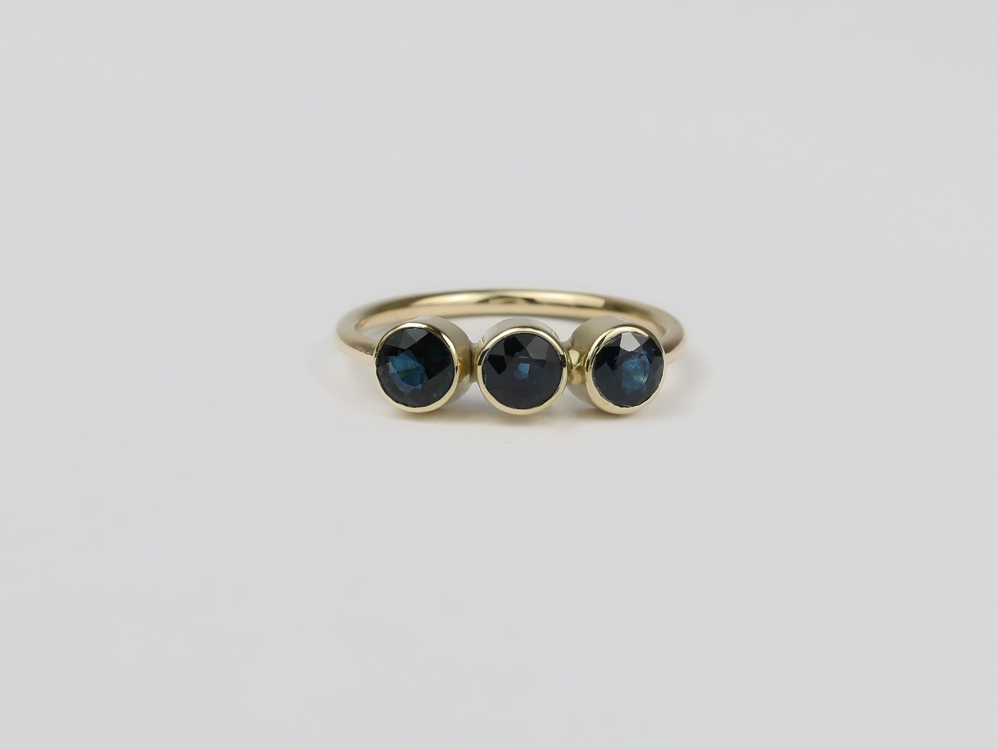 Royal Strength – A gold ring with three dark blue sapphires. Powerful in appearance and striking in its deep, royal blue.