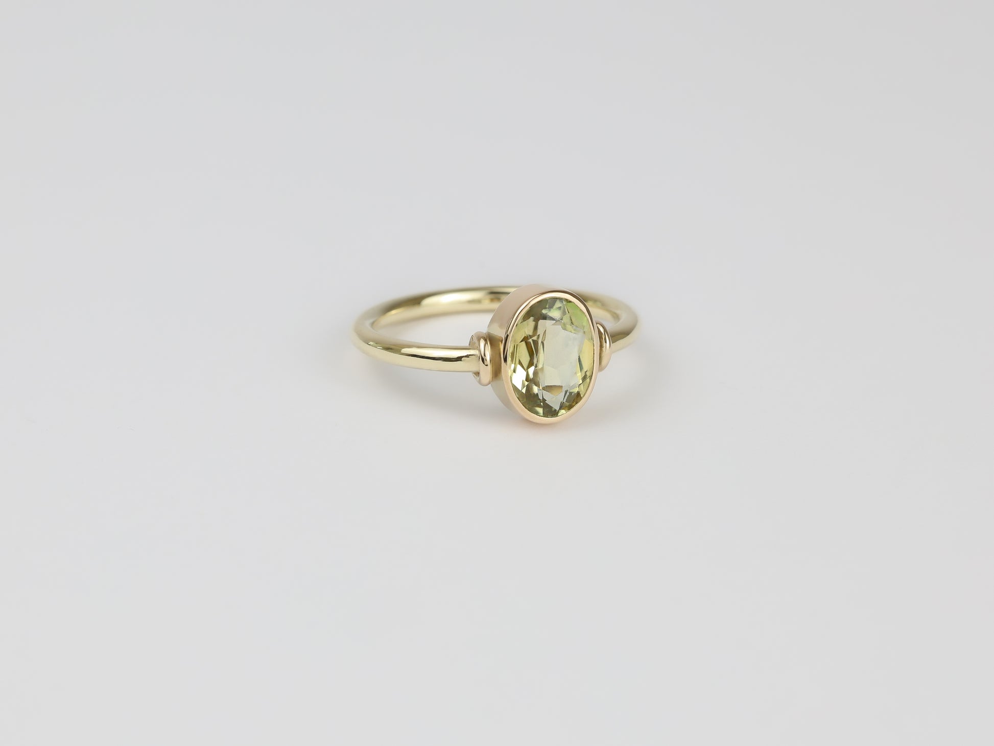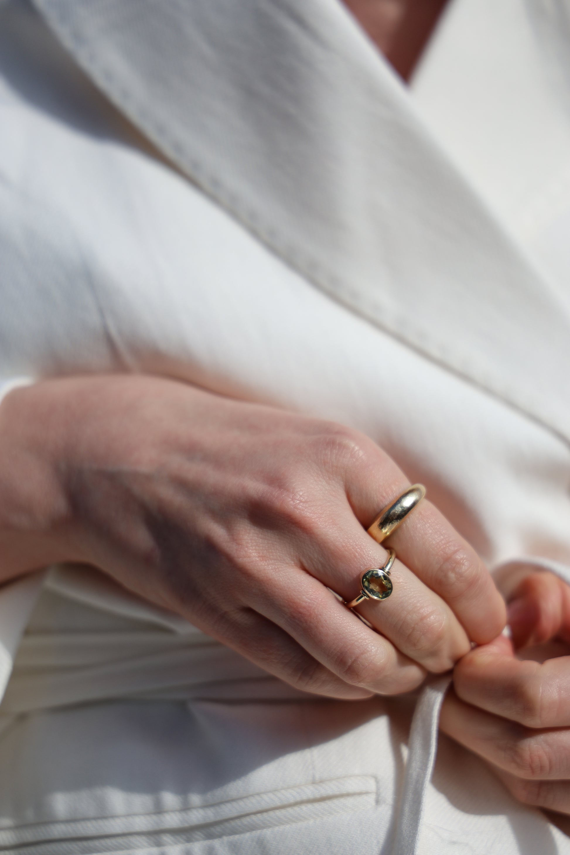 Green splendor – A sturdy 14k gold ring with a round 2mm band and a dazzling natural green tourmaline. A ring that makes an impression.